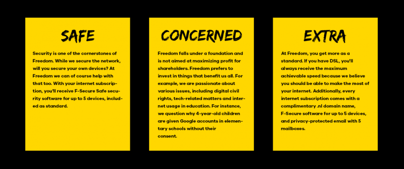 Freedom goes further than just offering internet, TV and telephone. Freedom stands for an open and safe internet and believes that it should be accessible to everyone. We are working hard on this (together with other parties). When you choose Freedom, you are not only choosing internet access, but also online security, privacy and a very helpfull helpdesk.