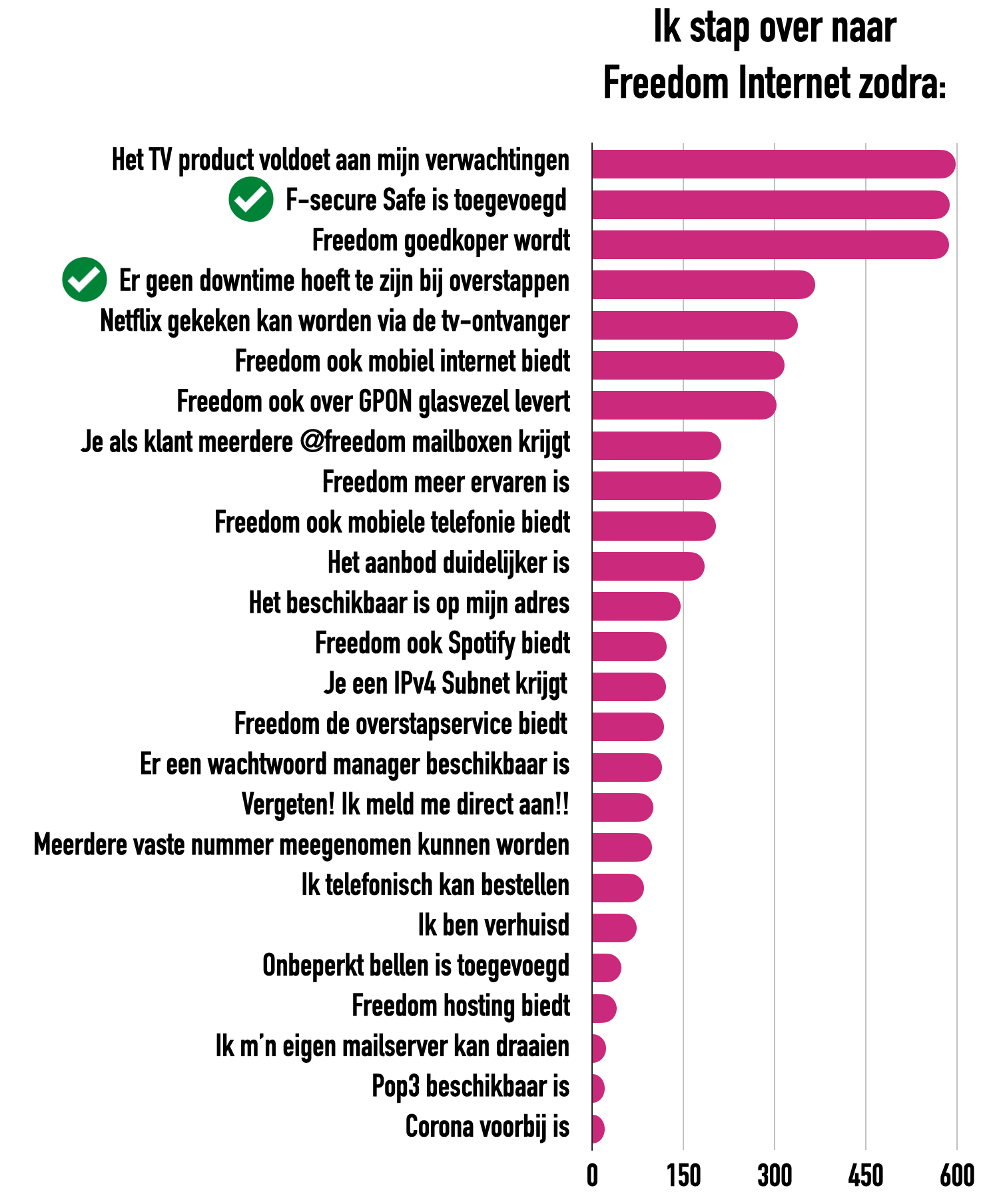 Het eerste resultaat hebben we inmiddels verwerkt: F-Secure werd veel genoemd als wens en behoefte. Inmiddels is F-Secure standaard onderdeel van onze dienstverlening. Ook hebben we het overstappen onder de loep genomen. Ook daar zijn verbeteringen doorgevoerd waardoor we nu met trots kunnen zeggen dat overstappen binnen dezelfde techniek (van glas naar glas of van dsl naar dsl) in 99% van de gevallen zonder downtime plaatsvindt.Zoals je ook kan zien, zijn er veel reacties gekomen op TV via Freedom.